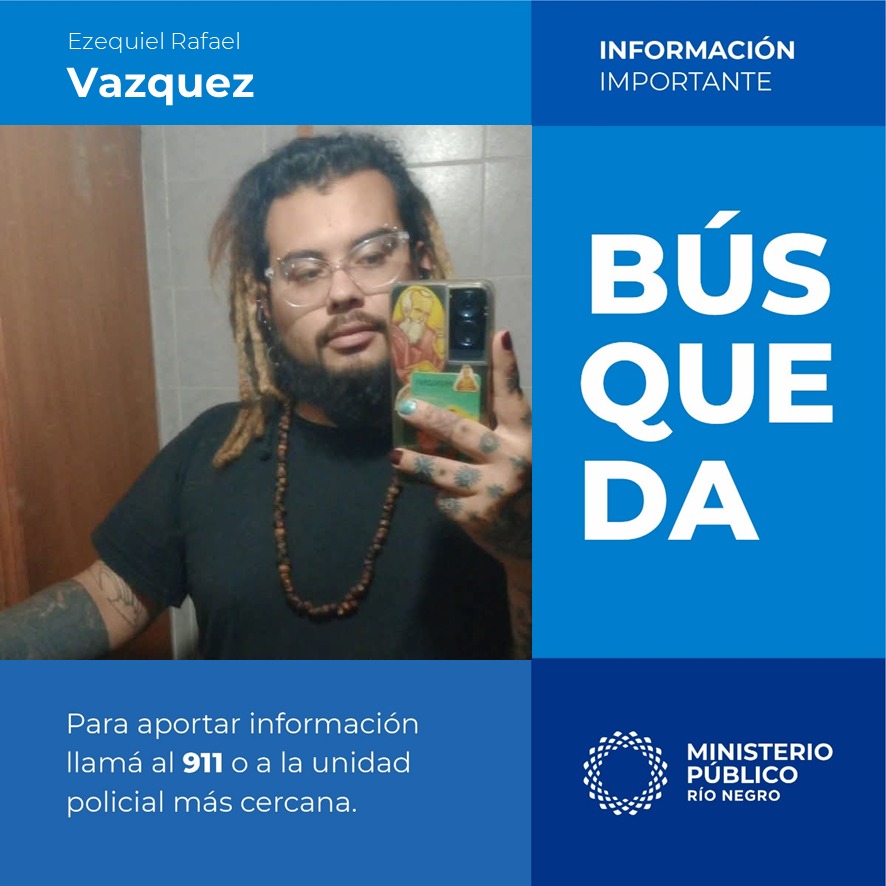 Se solicita colaboración para dar con el paradero de Ezequiel Rafael Vázquez, de 26 años, quien fue visto por última vez a fines de febrero en la ciudad de General Roca.