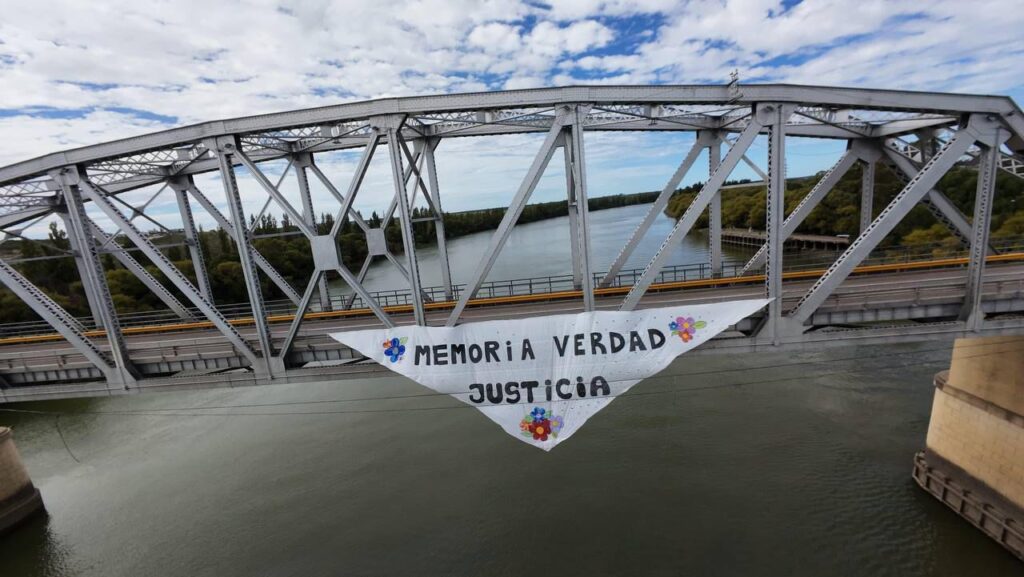 Allí se desplegó un pañuelo gigante en el centro del puente, sobre el río, visible desde ambas ciudades, como representación del histórico emblema de la lucha por la Memoria, la Verdad y la Justicia y del compromiso con el “Nunca Más”.