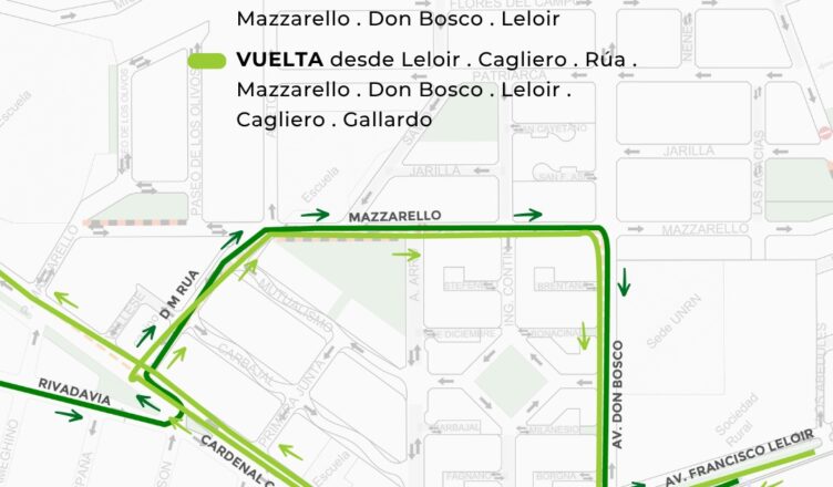 El nuevo sentido será: Sentido desde la zona céntrica hacia los barrios Guido e Inalauquen: el colectivo transita por calle Rivadavia, retoma por Cagliero hasta Rua ingresando hasta Mazarello, luego gira a la derecha hasta su salida por Avenida Don Bosco y continúa por Leloir.