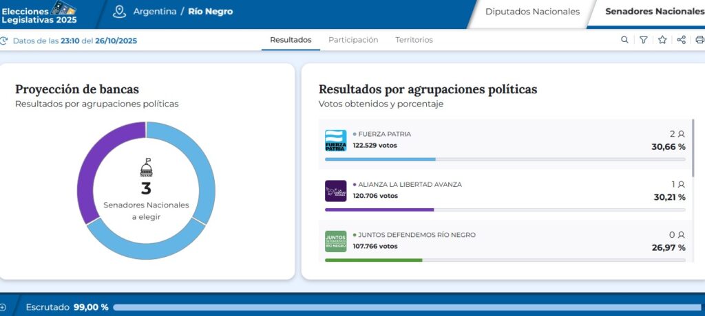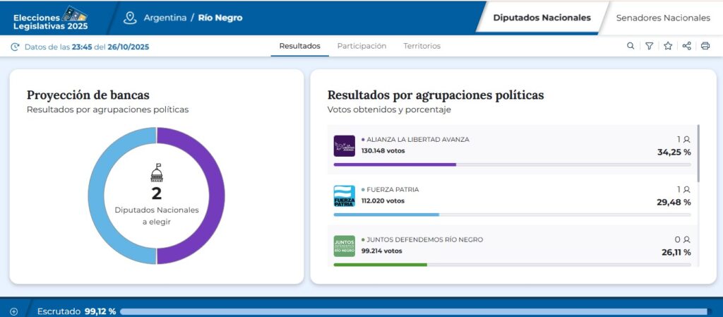 Con una participación de aproximadamente el 69 por ciento del padrón electoral y con el 98,69 por ciento de las mesas escrutadas, la Alianza La Libertad Avanza se posiciona como la fuerza política ganadora en Río Negro. Este proceso electoral marcó la implementación del nuevo sistema de Boleta Única de Papel (BUP), utilizado por primera vez en estas elecciones nacionales, lo que, según las autoridades electorales provinciales, contribuyó a un recuento más ágil y eficiente.