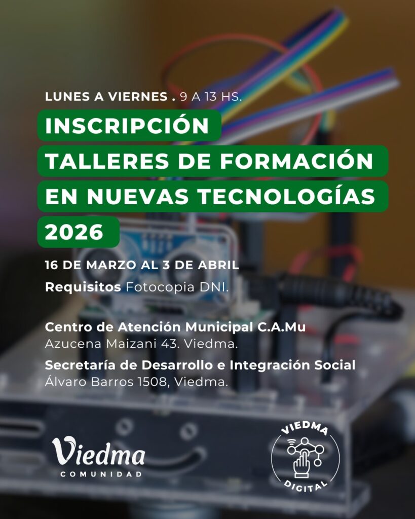 La Municipalidad de Viedma informa que se encuentran abiertas las inscripciones para participar de los talleres de nuevas tecnologías 2026, una propuesta orientada a promover la formación digital y el acceso a herramientas tecnológicas para la comunidad.